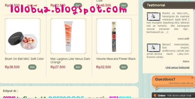 contoh item yang dijual di laku.com, Kosmetik, liat harganya! terjangkau ya, but semua golongan, skarang bisa tampil cantik tanpa mengeluarkan biaya besar :) naa, belanja di Laku.com gk perlu takut dong, kalo ini penipuan, mau bukti? baca aja testimonial para pembeli, di sebelah kanan, dan di bawah ada kotak balon,
